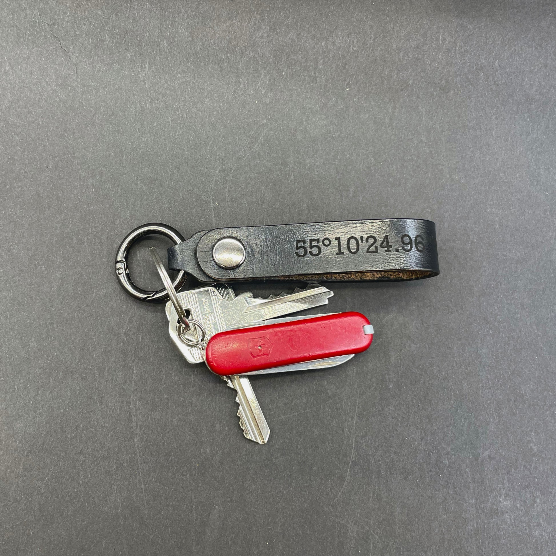 Graviruoti raktų pakabukai su koordinatėmis. Jūsų norimos vietos koordinates išgraviruosime ant jūsų pasirinktos spalvos odos.