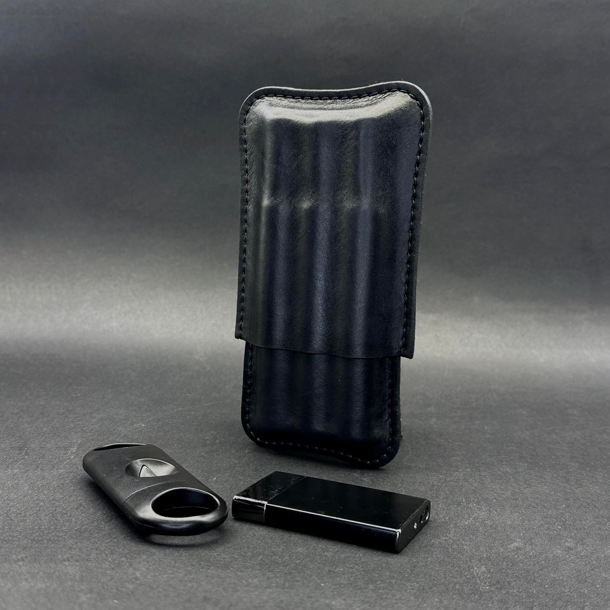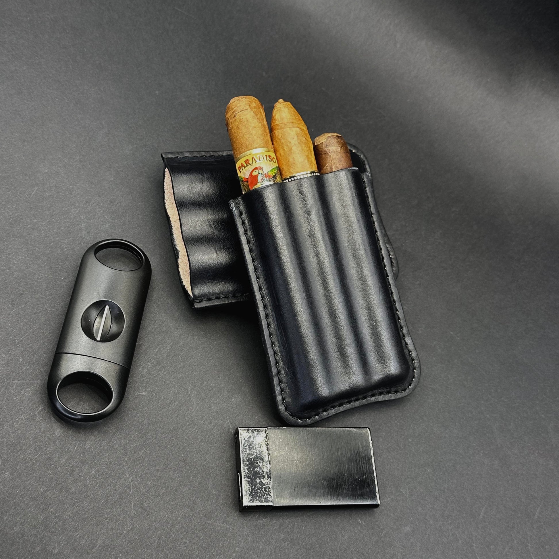 Natūralios, juodos spalvos odinis cigarų dėklas pritaikytas 3 cigarų laikymui. Dėklas išformuotas taip, kad kiekvienas cigaras turi savo vietą, kas leidžia stabiliai ir saugiai išlikų savo vietoje. Dėklas iš dviejų dalių įsimaunančių viena į kitą.